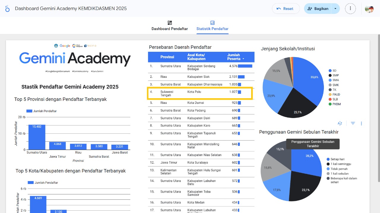 Dalam pelaksanaan Program Gemini Academy tahap kedua yang digagas oleh Kementerian Pendidikan Dasar dan Menengah melalui Direktorat Jenderal Guru, Tenaga Kependidikan, dan Pendidikan Guru bekerja sama dengan PT Reformasi Generasi Indonesia (REFO), yang merupakan Google Partner, Kota Palu berhasil menempati peringkat ke-4 nasional dari jumlah peserta yang mendaftar.