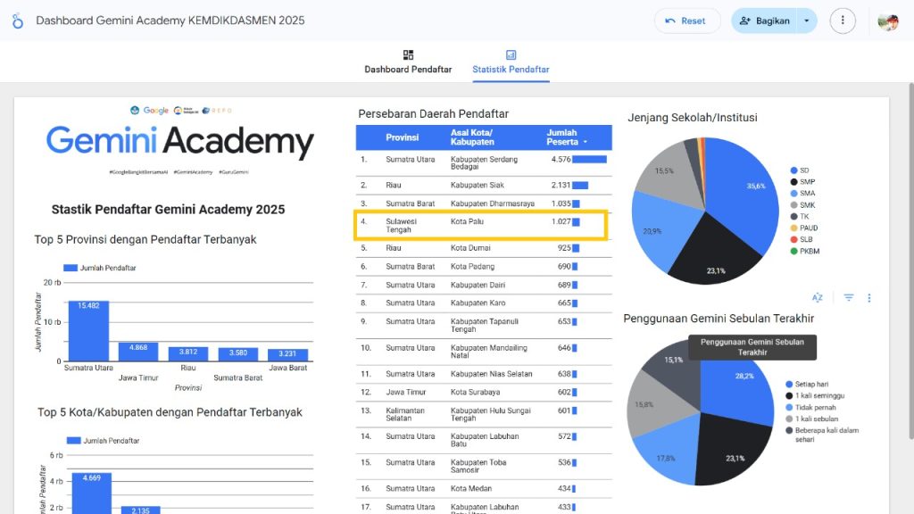 Dalam pelaksanaan Program Gemini Academy tahap kedua yang digagas oleh Kementerian Pendidikan Dasar dan Menengah melalui Direktorat Jenderal Guru, Tenaga Kependidikan, dan Pendidikan Guru bekerja sama dengan PT Reformasi Generasi Indonesia (REFO), yang merupakan Google Partner, Kota Palu berhasil menempati peringkat ke-4 nasional dari jumlah peserta yang mendaftar.