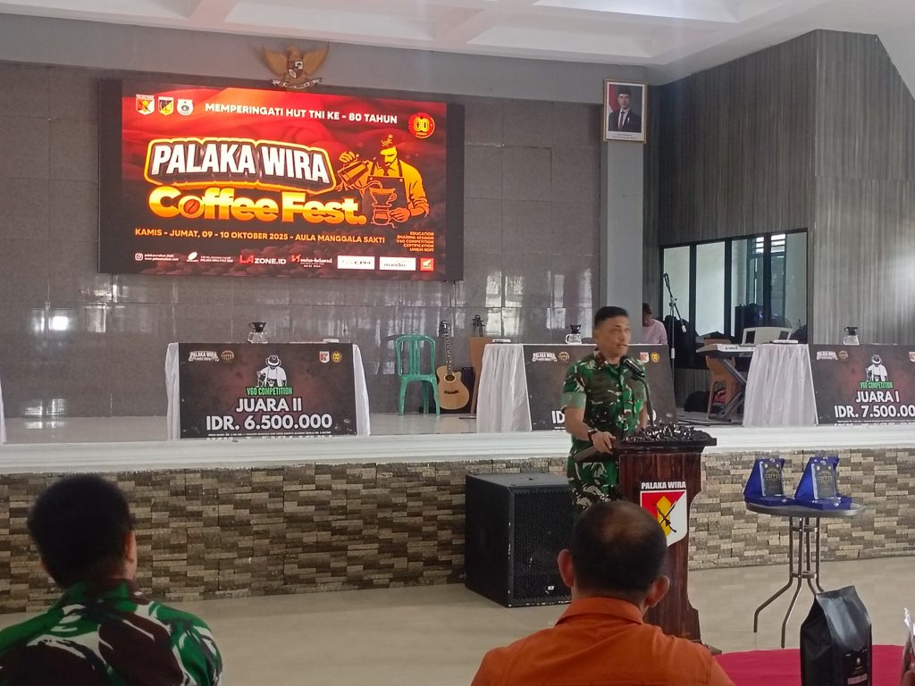 Palu, SatuSulteng.com – Panglima Komando Daerah Militer (Pangdam) XXIII/Palaka Wira, Mayor Jenderal TNI Jonathan Binsar Parluhutan Sianipar, mengadiri pembukaan Palaka Wira Coffee Fest 2025, yang digelar di Aula Manggala Sakti Makodam XXIII/Palaka Wira, jalan Jenderal Sudirman Palu, Kamis (9/10/2025).
