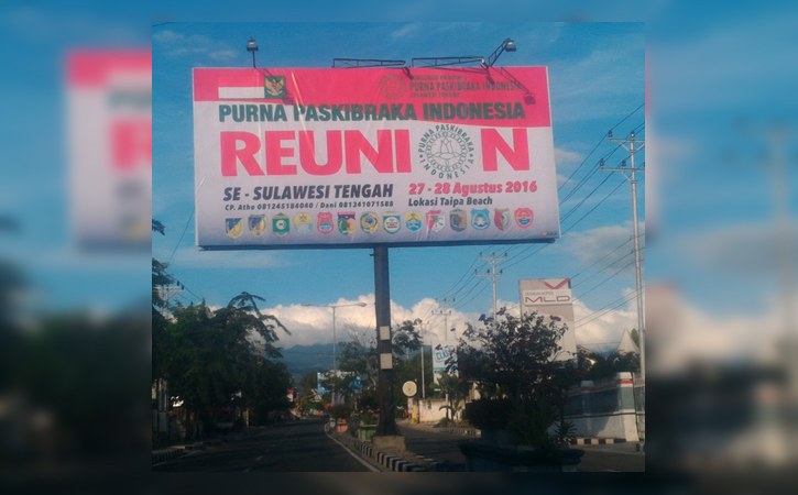 Palu, Satusulteng.com – Baliho berukuran 5×10 meter berdiri tegak disalah satu jalan protokol di Kota Palu, tepatnya di Jl. Ir. H. Juanda. Baliho tersebut bertuliskan “Purna Paskibraka Indonesia Reunion se-Sulawesi Tengah. Ini sebuah langkah sosialisasi dan promosi reuni akbar Purna Paskibraka Indonesia (PPI) se-sulawesi tengah tahun 2016 yang dimandatkan saat acara halal bi halal PPI se-Sulawesi Tengah tahun 2011 yang lalu. Awalnya kegiatan reuni akbar direncanakan pada tahun 2012 namun baru bisa terlaksana tahun 2016.